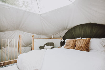 Each dome features an en-suite shower and toilet, a convenient kitchenette, king bed with luxury linens, mezzanine with a queen bed, providing all the essentials for a relaxing and enjoyable stay. Whether you're seeking a quiet retreat or romantic getaway, our domes offer the perfect blend of comfort and nature for a memorable glamping experience.