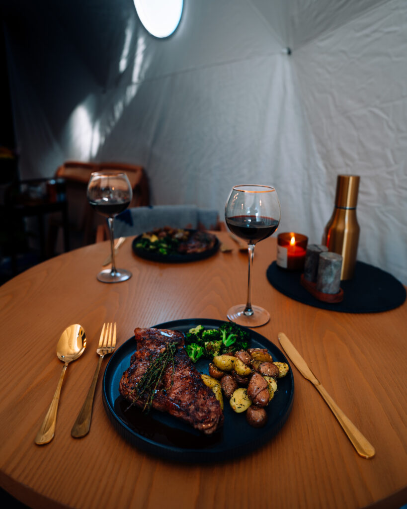 One of the most loved add-ons for couples celebrating an anniversary or milestone is a private steak dinner delivered directly to your dome.